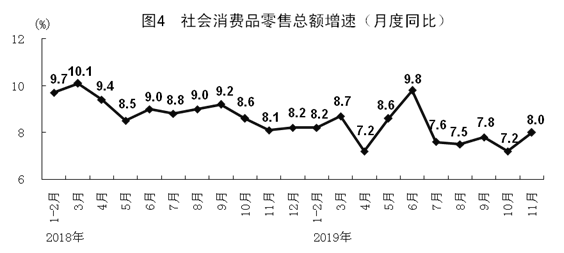 11月份,社会消费品零售总额38094亿元,同比增长8.0%,增速比上月加快0.8个百分点。其中,扣除汽车以外的社会消费品零售总额增长9.1%。1-11月份,社会消费品零售总额372872亿元,同比增长8.0%。按经营单位所在地分,11月份,城镇消费品零售额32345亿元,增长7.9%;乡村消费品零售额5748亿元,增长9.1%。按消费类型分,餐饮收入4964亿元,增长9.7%;商品零售33130亿元,增长7.8%。消费升级类商品较快增长。限额以上单位化妆品类、饮料类和通讯器材类商品分别增长16.8%、13.0%和12.1%,增速分别快于全部社会消费品零售总额8.8、5.0和4.1个百分点。